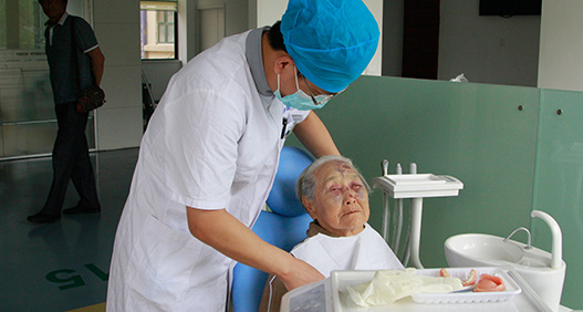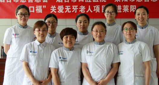 "孝口福"关爱无牙老人项目暨"8020"烟台市老年人口腔健康关爱活动首站在海阳市社会福利中心正式启动,共有四名医生,一名护士和技师参与本次活动。