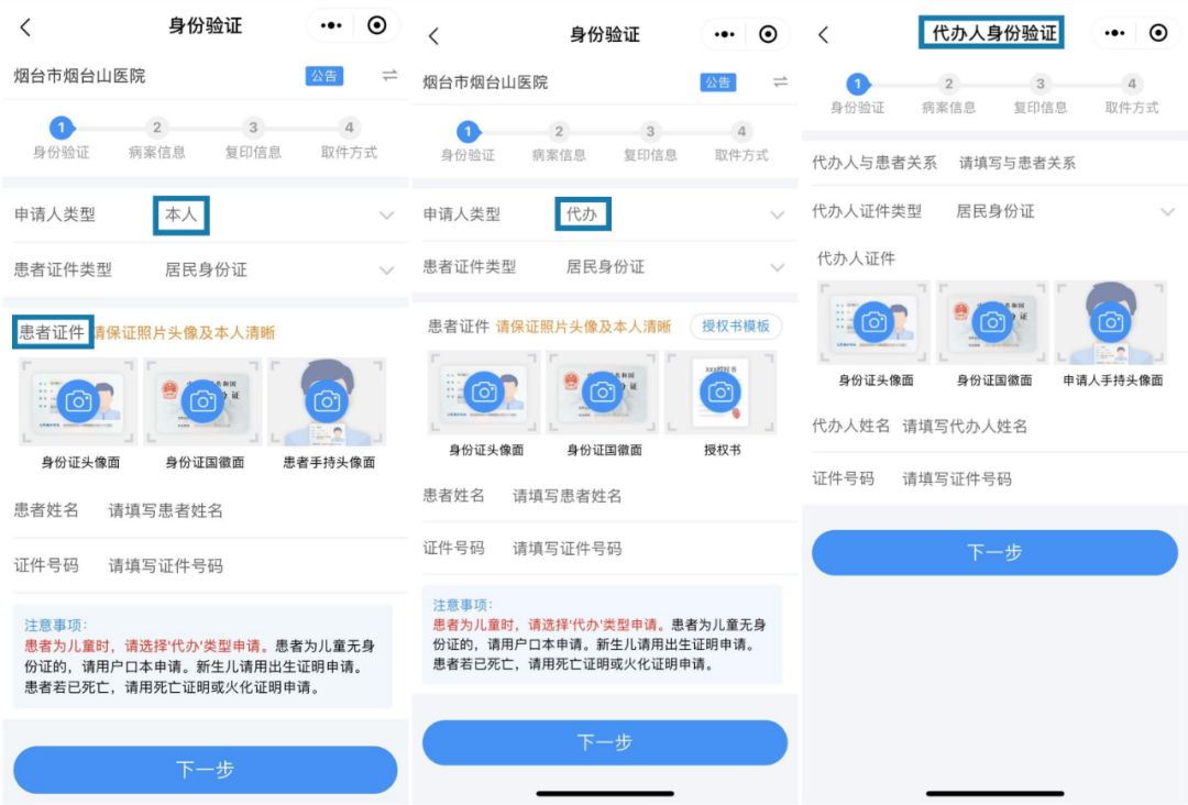 3.进行身份验证,选择申请人类型、患者证件类型,提交患者证件照片(一般为患者本人身份证正、反面及患者手持身份证照片),填写患者姓名、证件号码。
