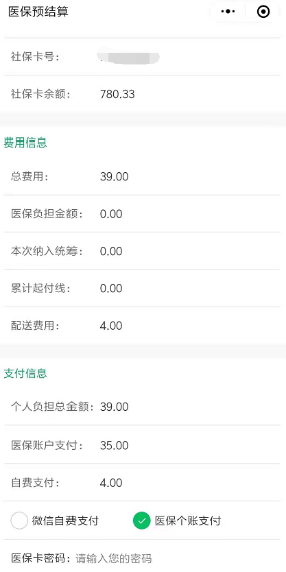 3. 如购置的商品中,既包含自费商品,又包含个账支付药品,支付原则是先付自费部分,再进行医保个人账户支付。配送费用不可使用个人账户支付。