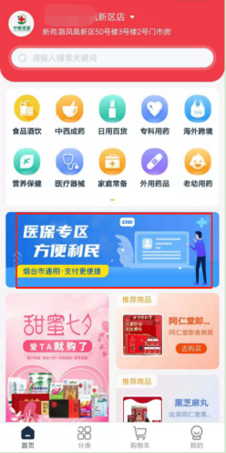 打开线上药店小程序,自行选择药店,并点击【医保专区】选择药品;