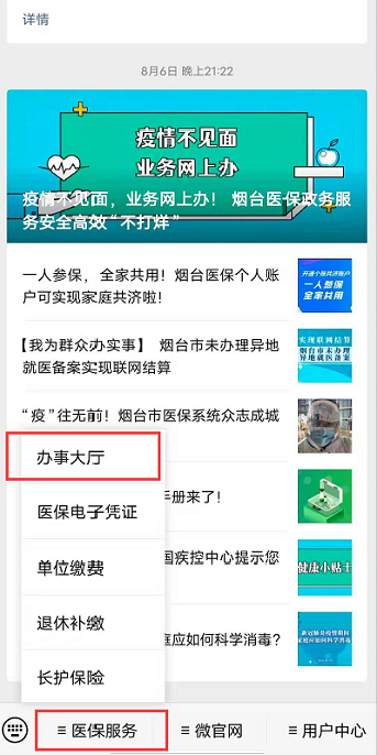 关注“烟台市医疗保障局”微信公众号,在公众号首页→医保服务→办事大厅→我要办事→互联网+医保,登录“烟台互联网医保服务平台”,点击【药店商城】;