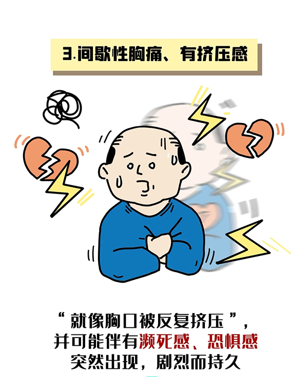 - 胸部不适:突发胸闷、胸痛、压榨感、紧缩感,持续不缓解,或间断发作,这是心肌缺血的典型信号,最需警惕。