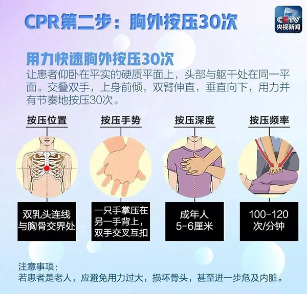 猝死发生后,黄金抢救时间仅4分钟,每延误1分钟,抢救成功率就下降10%,学会正确急救,能极大提高生还几率,具体步骤一定要记牢: