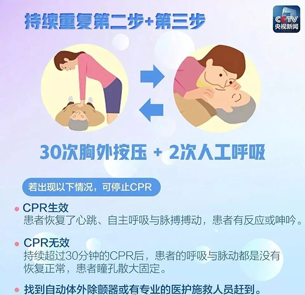 在急救人员到达前,持续进行胸外按压+人工呼吸(比例30:2),无急救经验者可单纯做胸外按压,切勿轻易放弃,直到专业人员接手。